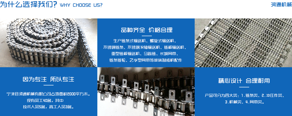 生產(chǎn)鏈條式輸送機(jī)、螺旋式輸送機(jī)、不銹鋼鏈條、不銹鋼滾軸輸送機(jī)、鏈板輸送機(jī)、重型鏈板輸送機(jī)、馬蹄鏈、長城網(wǎng)帶、鏈條鏈輪、乙字型網(wǎng)帶等玻璃制瓶機(jī)配件,食品機(jī)械配件及各種網(wǎng)帶的專業(yè)廠家 ,多年來產(chǎn)品暢銷各地玻璃廠和食品廠,在玻璃制品等行業(yè)中享有較高的聲譽。公司集摸具開發(fā)、機(jī)械設(shè)計生產(chǎn),銷售于一體的生產(chǎn)型企業(yè)。生產(chǎn)的自動化流水線金屬傳動網(wǎng)帶、鏈條等產(chǎn)品廣泛用于玻璃機(jī)械、食品機(jī)械、化纖機(jī)械、醫(yī)藥、電子、烘干機(jī)械、輪胎機(jī)械等行業(yè)。產(chǎn)品多銷往各個城市的機(jī)械廠、食品廠和一些涉及流水線或自動化設(shè)備的公司。